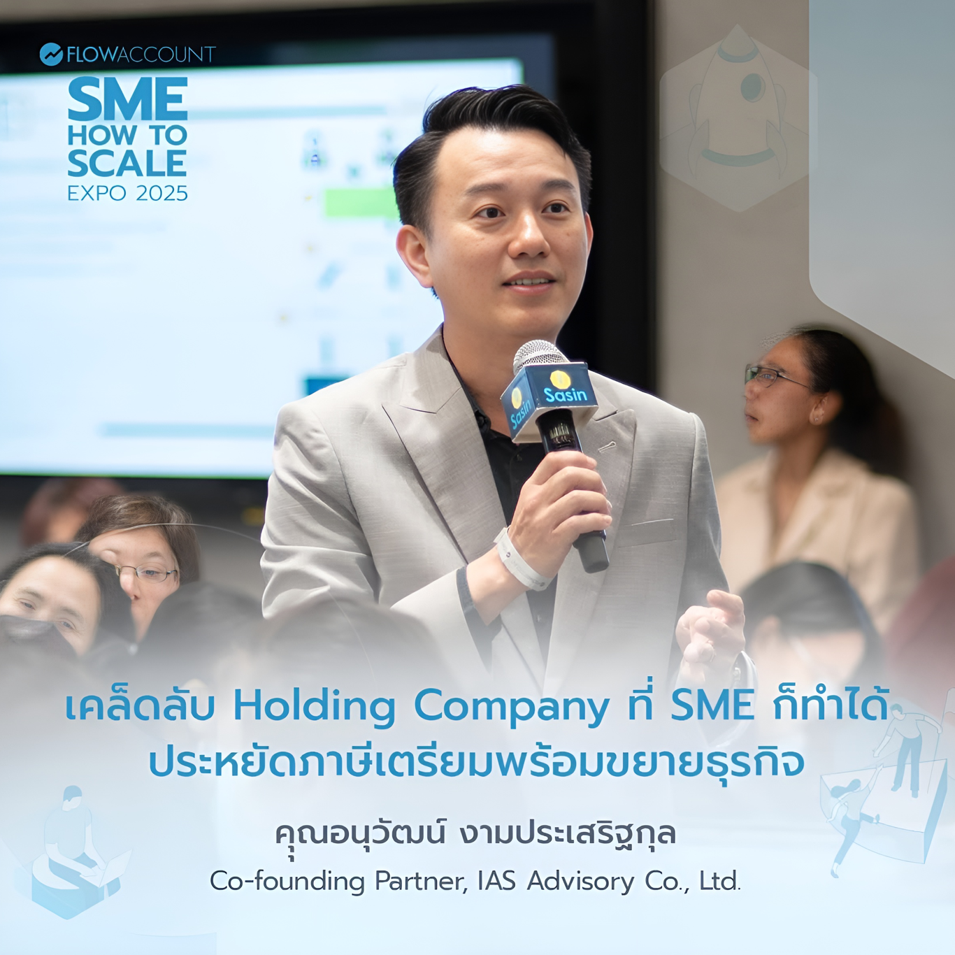Summary of key points from the session, “Holding Company Secrets for SMEs – Tax Savings & Business Expansion Preparation,” conducted by IAS Advisory co-founder Mr Anuwat Ngamprasertkul and firm partner Mr Supachot Prasankiattiraj at FlowAccount’s recent event, “SME How to Scale Expo 2025.”